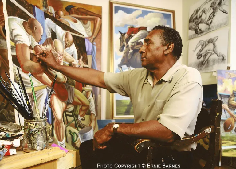 A leading 20th century artist well-known for his unique style of movement, Ernie Barnes is the first American professional athlete to become a noted painter. His works are shown, collected and respected internationally. In pop culture Barnes’ artwork appears on music album covers, television and movies, especially his iconic dance hall scene, The Sugar Shack.